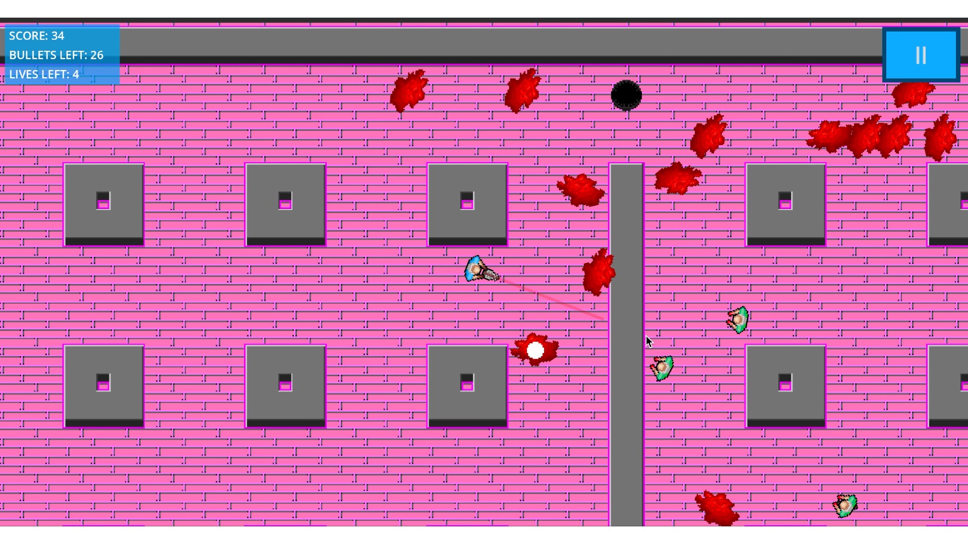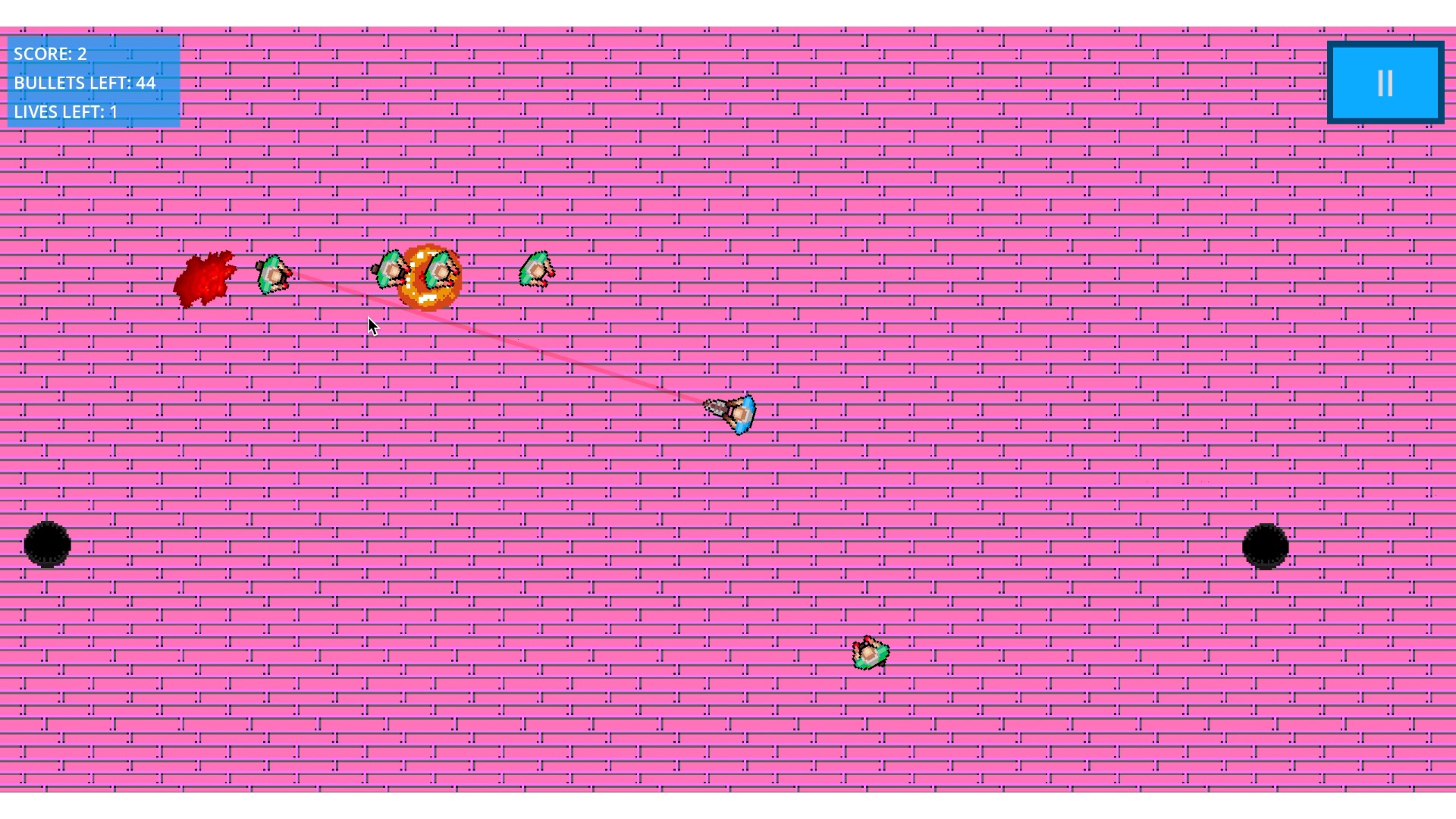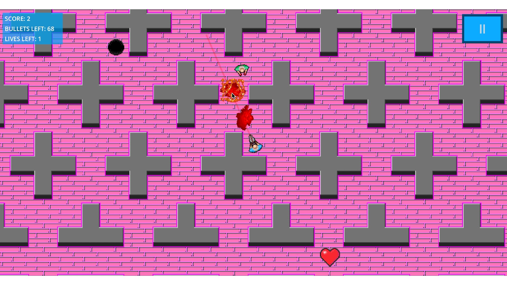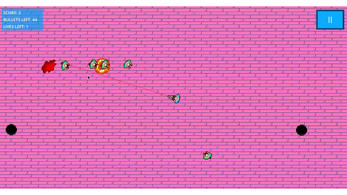Zombies spawn faster, run faster, as spawn more frequently the harder the difficulty you chose. The amount of lives and bullets you have also decrease with the harder difficulties. Zombies randomly drop: ammo boxes to restock your bullets, hearts to gain one life and a bomb to kill all zombies! Ammo boxes also spawn in the middle of the map if you run completely out. Hearts also spawn in the middle of the map if you are down to your last life.