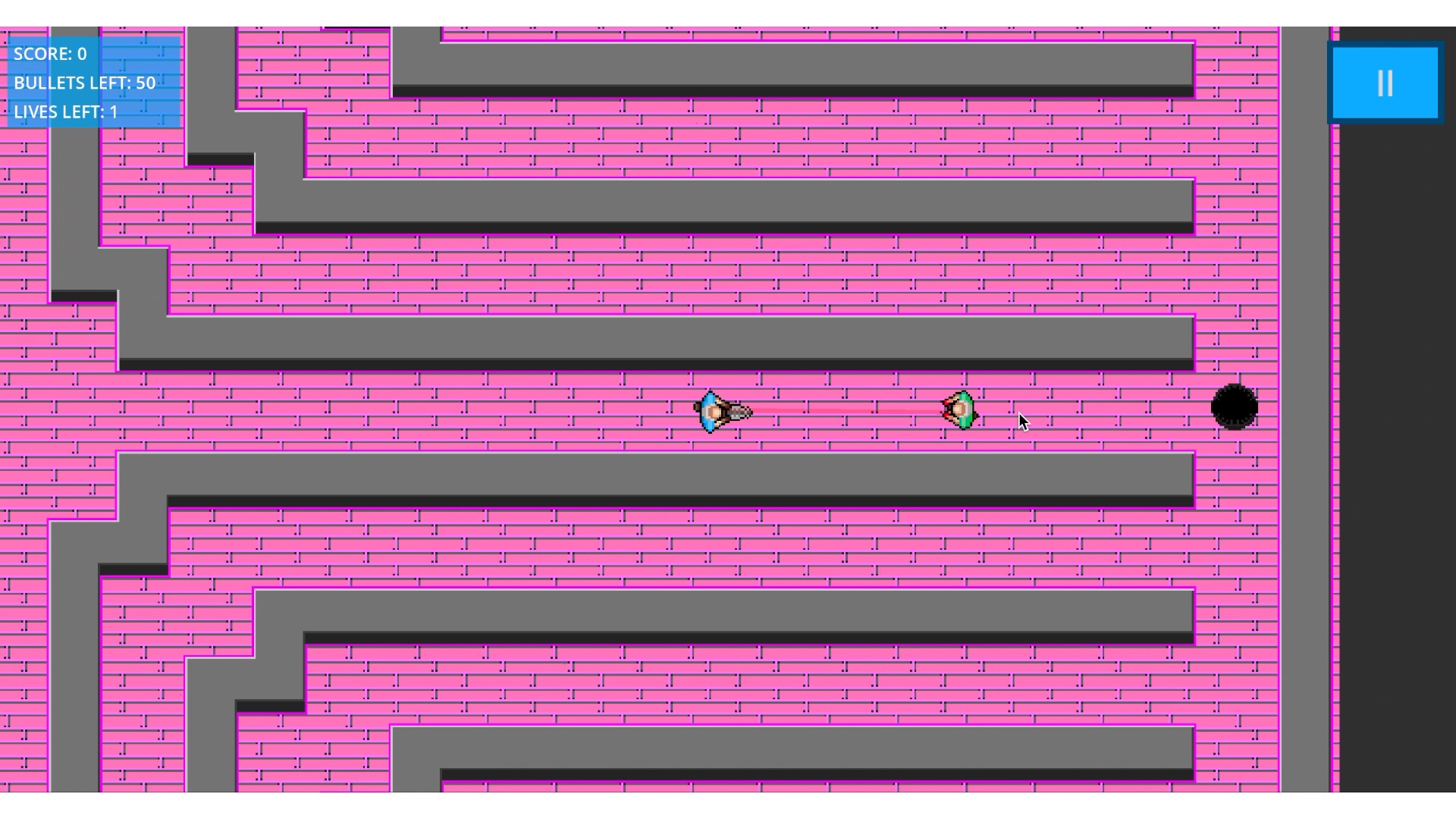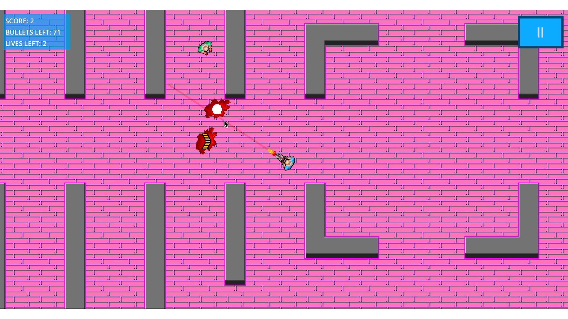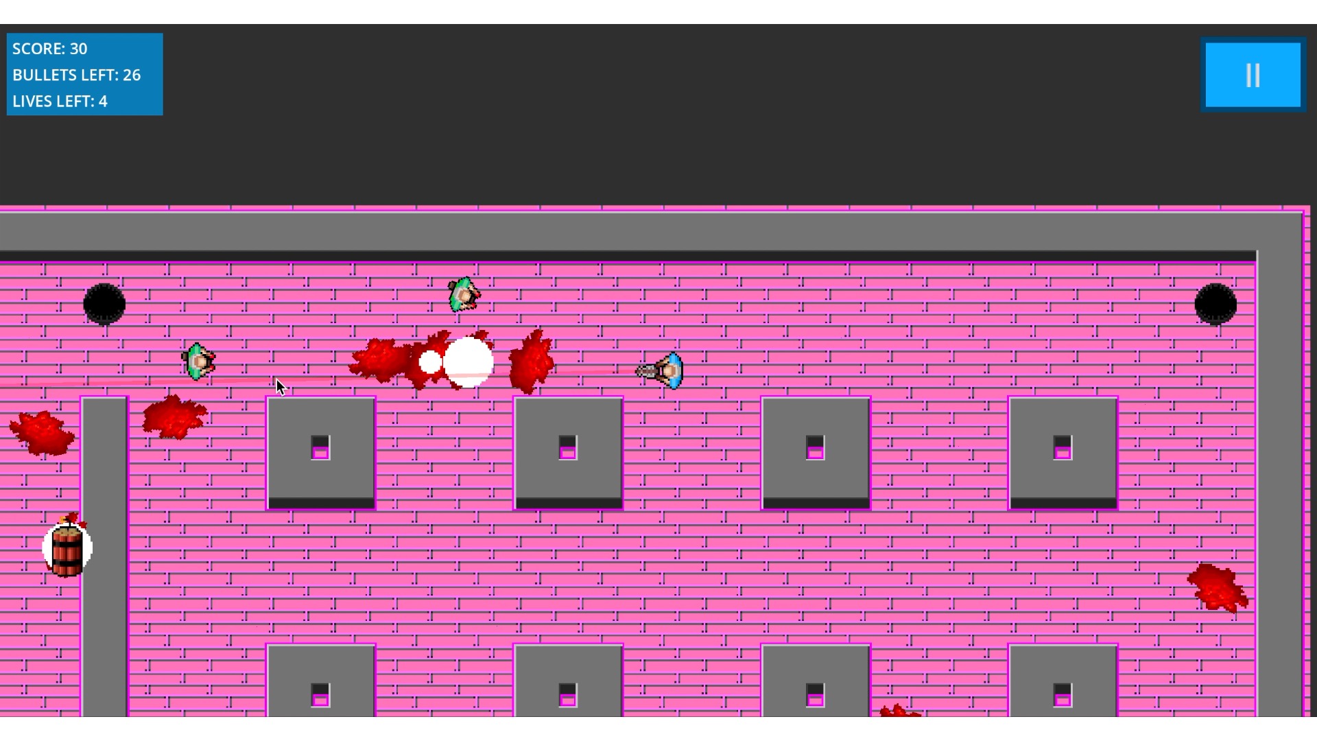 Zombies spawn faster, run faster, as spawn more frequently the harder the difficulty you chose. The amount of lives and bullets you have also decrease with the harder difficulties. Zombies randomly drop: ammo boxes to restock your bullets, hearts to gain one life and a bomb to kill all zombies! Ammo boxes also spawn in the middle of the map if you run completely out. Hearts also spawn in the middle of the map if you are down to your last life.